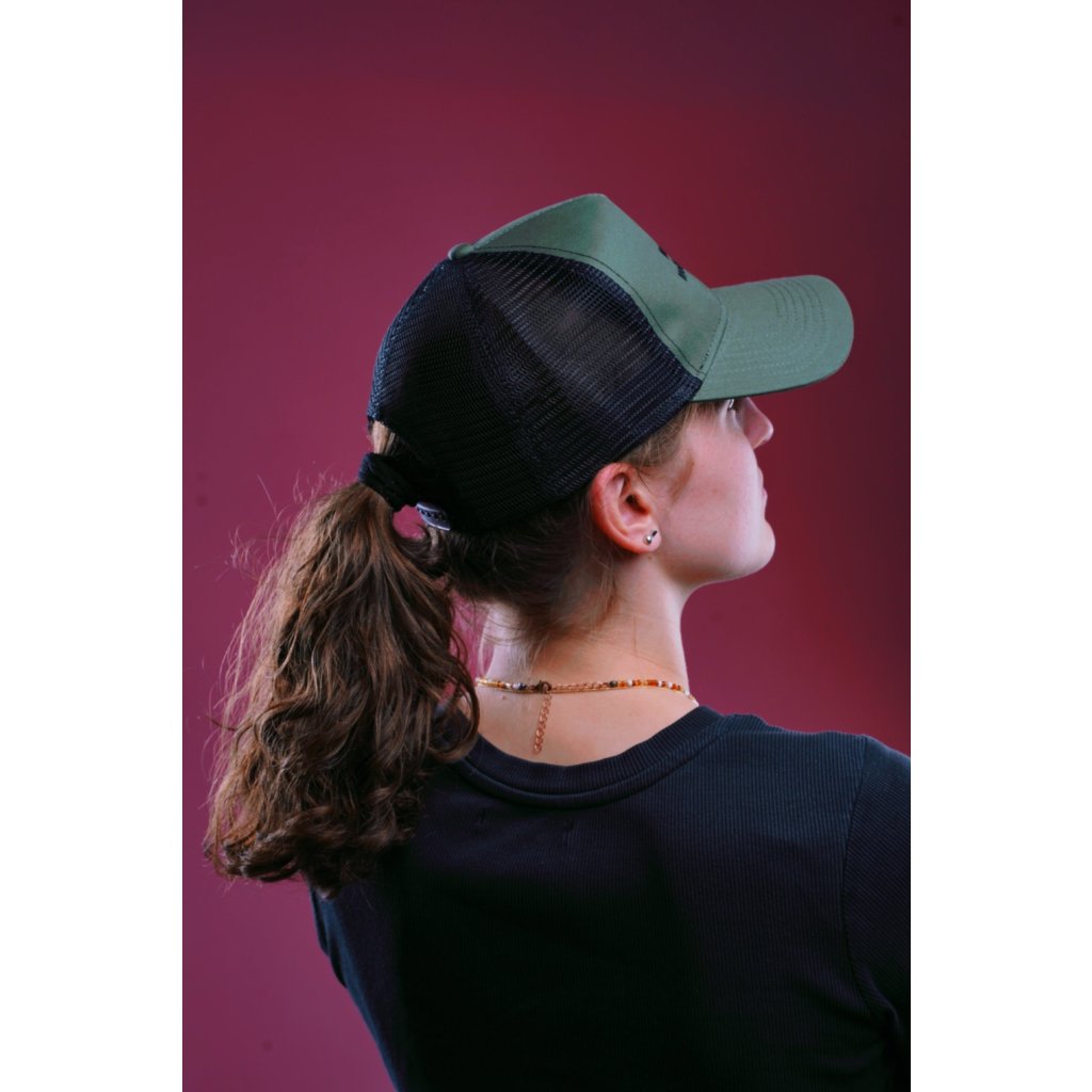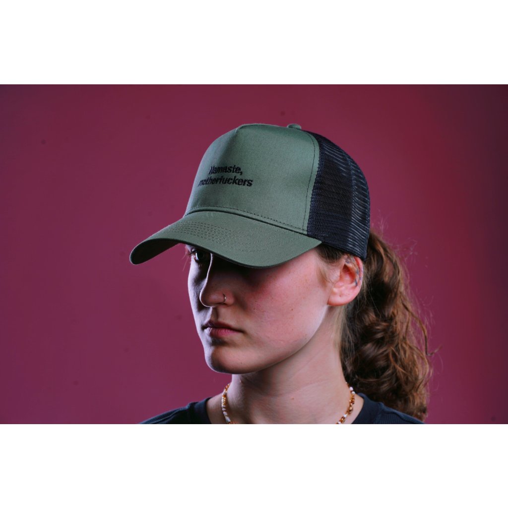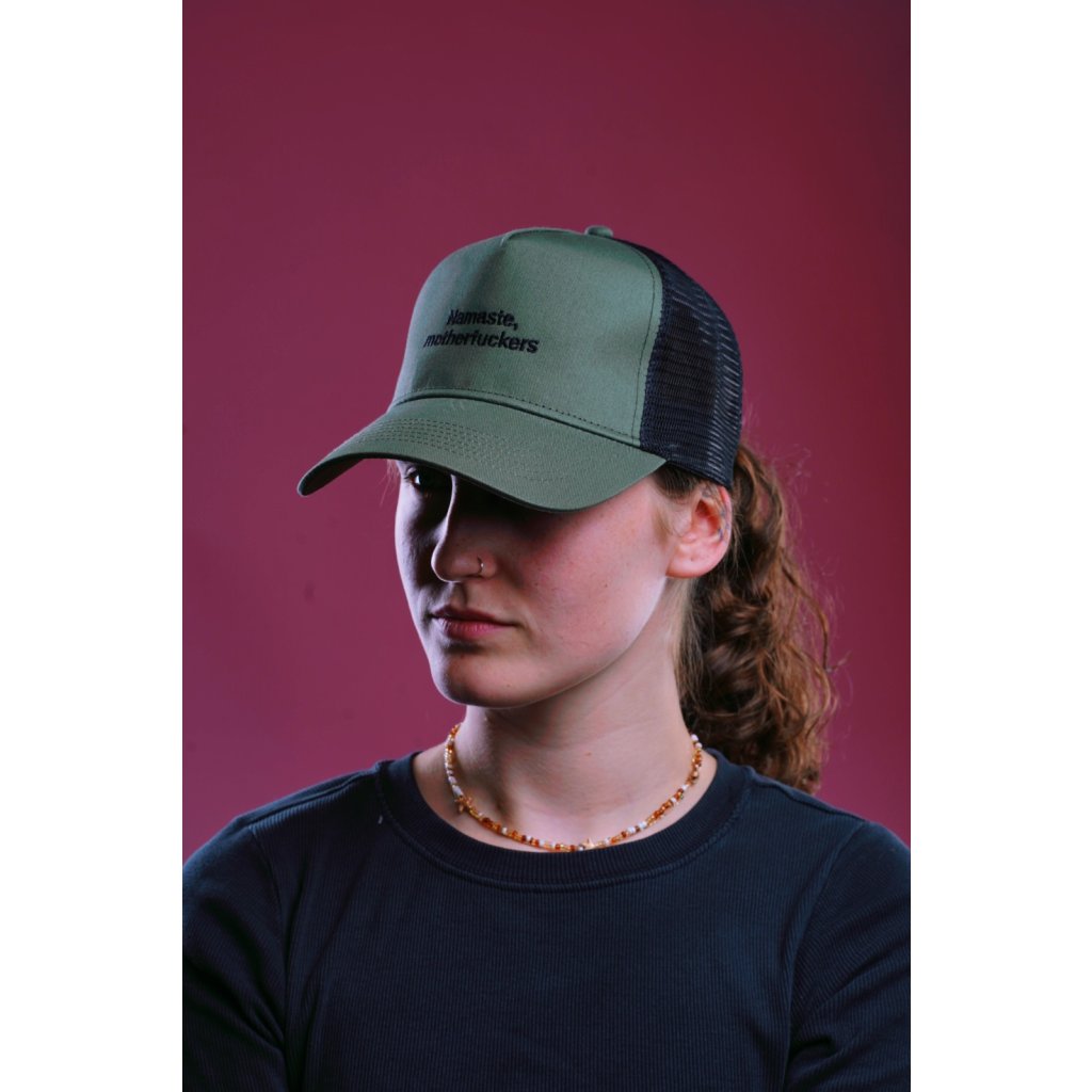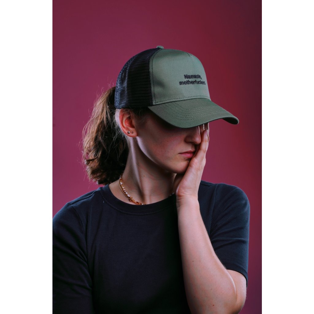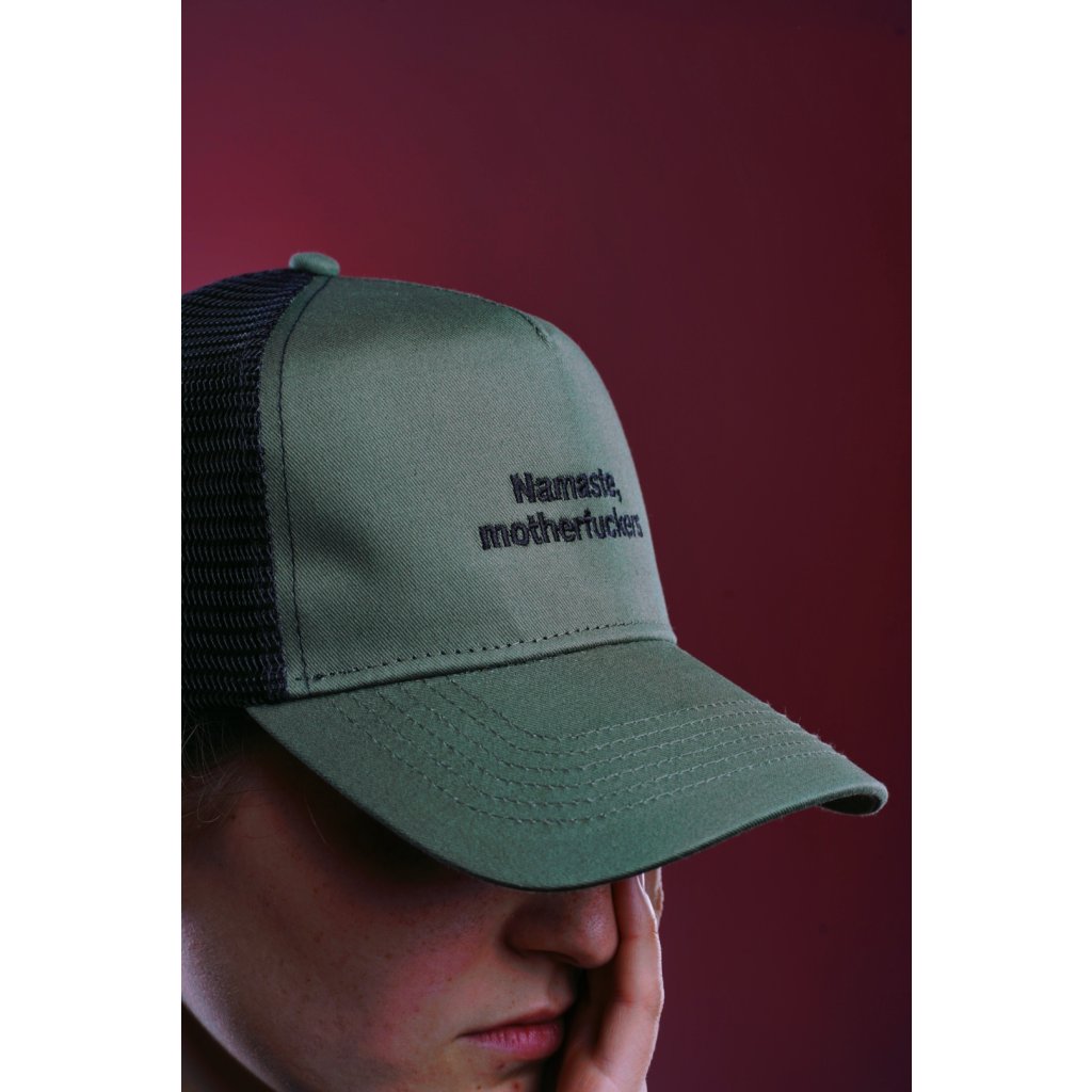Trucker kšiltovka olivová vyšitý nápis Namaste módní doplněk | na každý den
